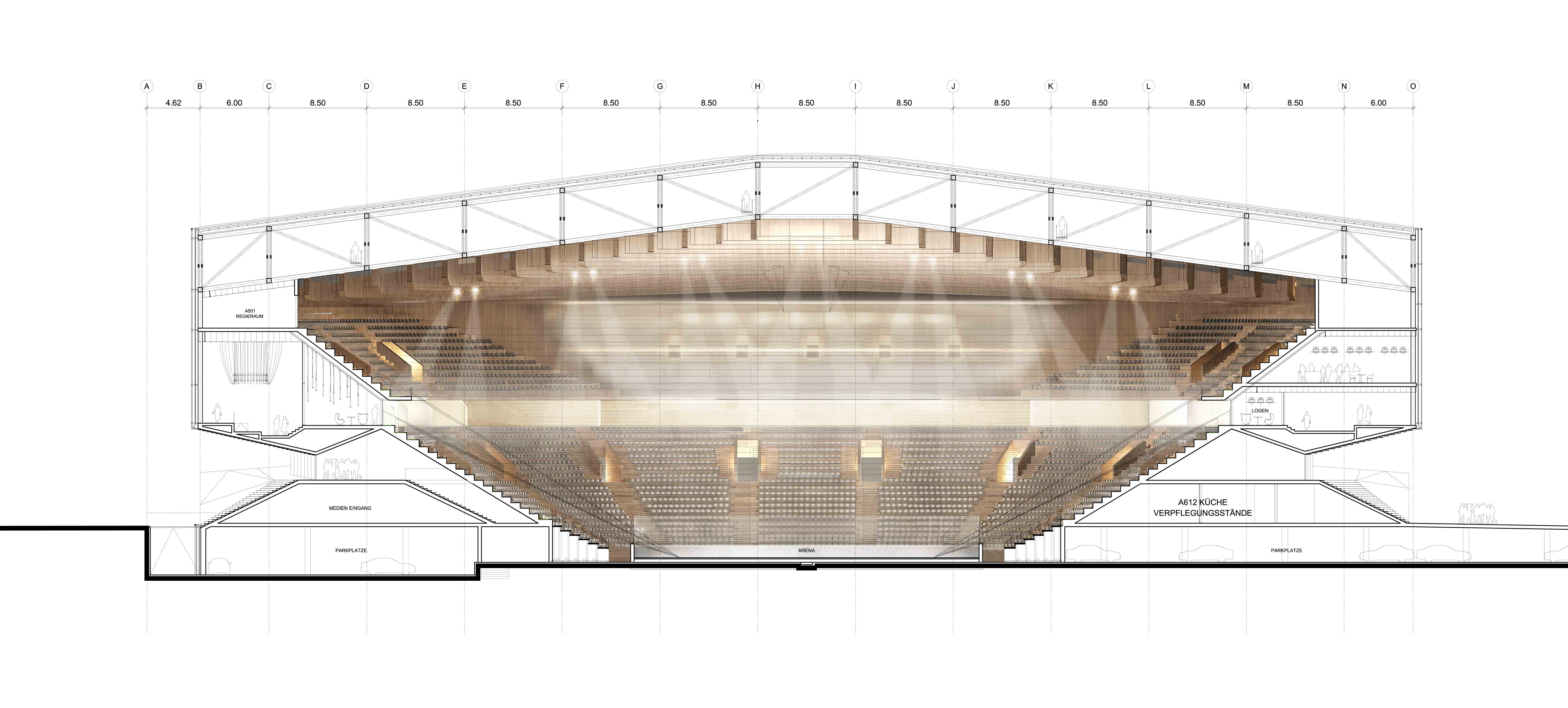 Sur une surface de 28 000 m² dans le quartier zurichois d’Altstetten, le long des voies ferrées qui relient la ville à l’ouest du pays, le projet installe un parallélépipède qui accueille un stade de hockey et une arène de volley-ball. Une découpe horizontale permet de ceindre ce volume d’une promenade galerie qui accueille les entrées. Les emmarchements, sorte de gradins en négatifs, créent une terrasse publique ouverte sur la ville. Le toit est travaillé en fonction du programme, avec une courbure convexe qui couvre le stade de glace et un creux au-dessus de la halle de volley-ball. Une nouvelle passerelle piétonne enjambe la voie rapide au nord et relie le site au quartier du Grünau.