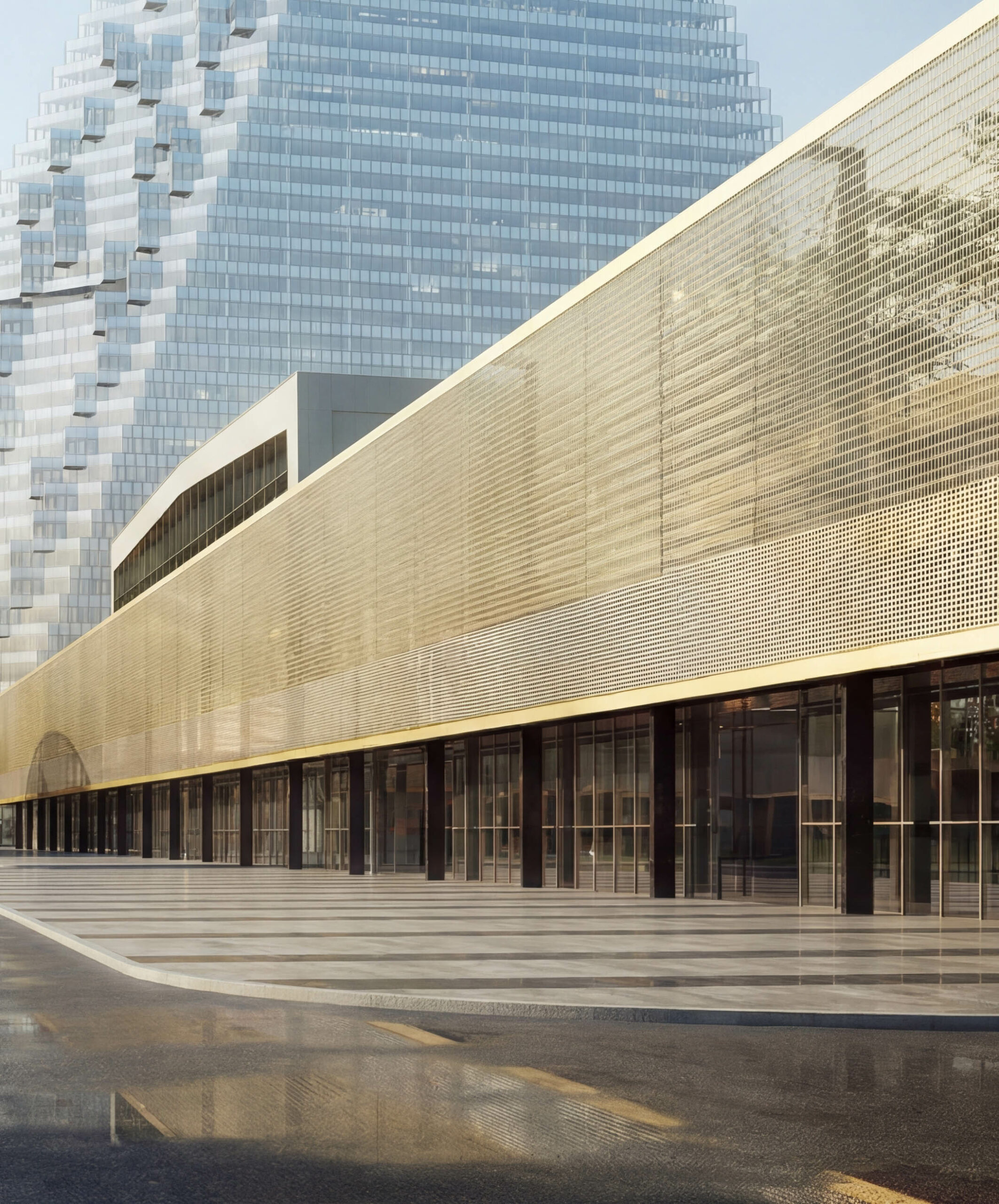 L’agence DPA conçoit la Fondation comme un don, un acte de partage, qui doit s’incarner dans l’ouverture de la collection à un large public, invité à déambuler dans un lieu unique. En découle un programme qui s’organise autour de sept axes principaux. Le premier vise à conserver le socle de l’île tel qu’il est, pour ne pas dénaturer l’identité du lieu. Le deuxième et le troisième axes privilégient les points de contact avec l’eau, l’un par l’élaboration autour du musée d’une promenade qui s’insère dans le paysage préexistant, l’autre par un plan légèrement incliné descendant vers le fleuve. Vient ensuite – c’est le quatrième point – la « grande robe » de l’édifice, cette maille métallique qui l’enveloppe et crée une sorte de narthex, un espace d’entre-deux enchevêtrant symboliquement les notions de centre et de marge.