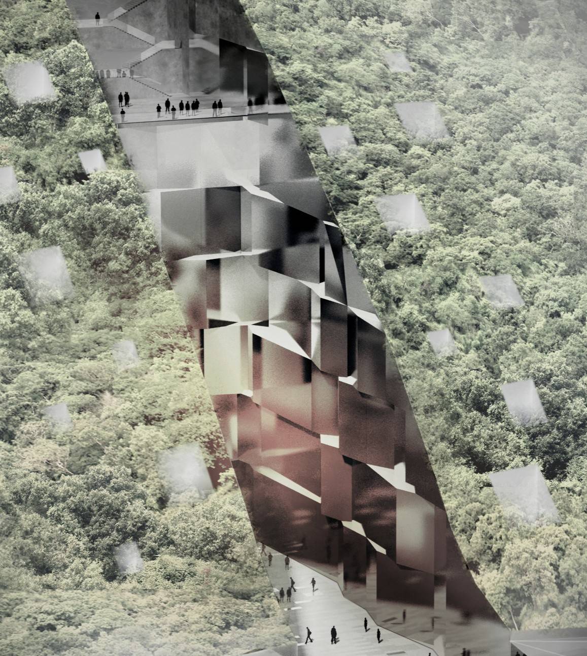 Sculpté comme une carrière de pierres marmoréenne, le sol dévoile une stratification complexe de plateformes et de salles conçues pour accueillir tous types d’expositions. En surface, la structure visible se réduit à une halle minimaliste et transparente, laissant deviner que l’essence du projet se déploie dans la profondeur. Ce dispositif architectural est une façon discrète d’accompagner le musée des Beaux-Arts intégrant le pôle muséal dans son ensemble. Depuis la rue supérieure surplombant le site, la couverture vitrée disparaît progressivement vers le lac Léman, fusionnant architecture et paysage.