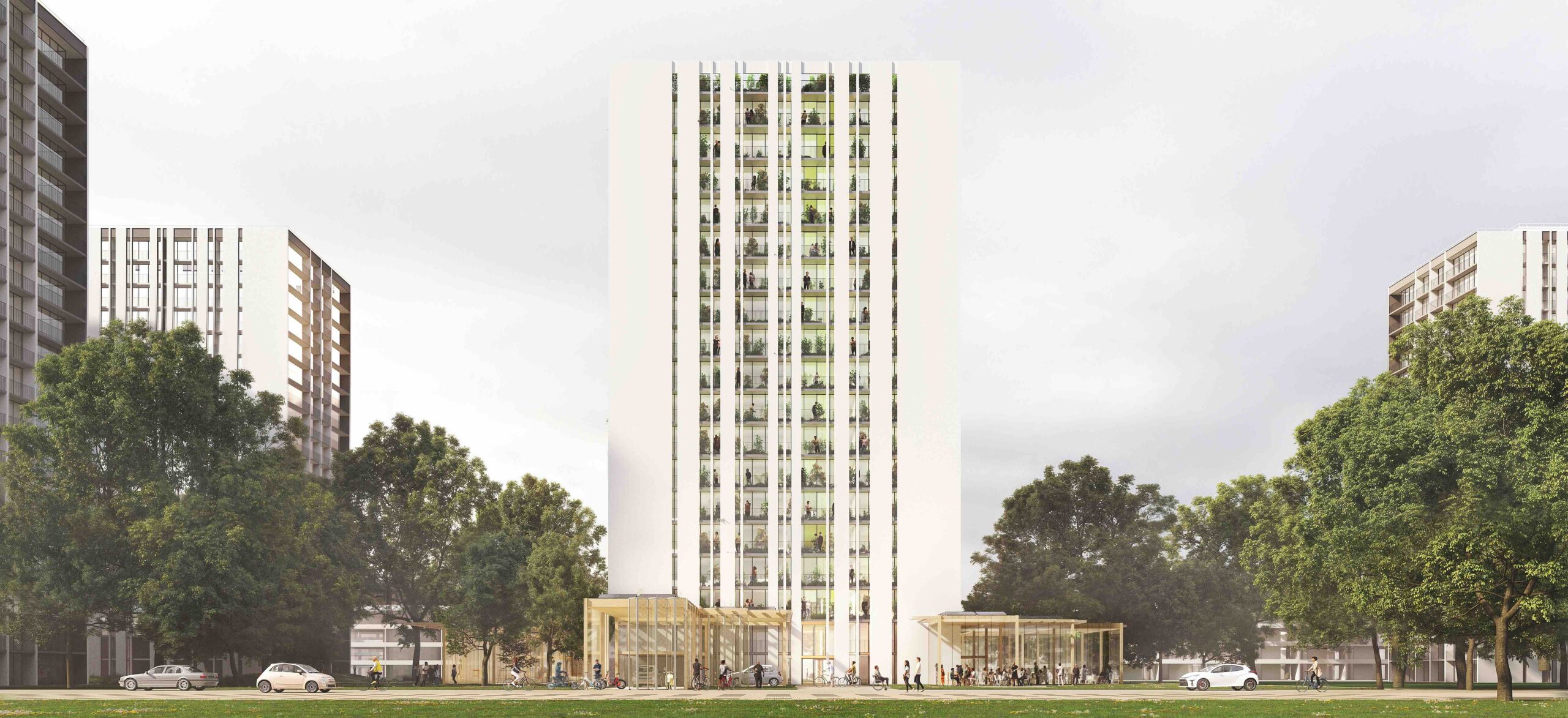Programme : réhabilitation de la Tour 08 avec un changement de destination en vue d’une réplicabilité et aménagement de la coulée verte reliant le quartier au centre-ville et au domaine universitaire.