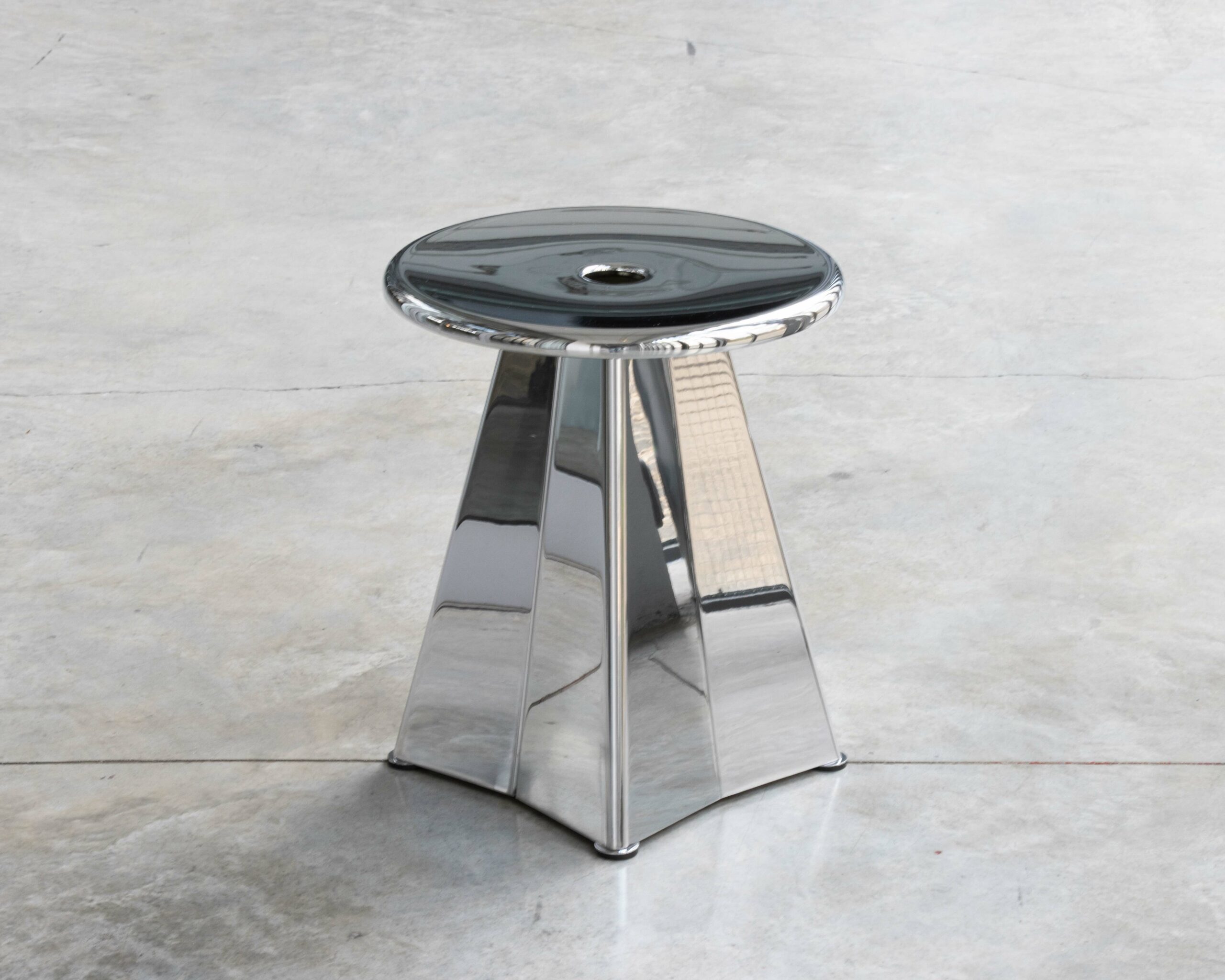 Pour sa 28ᵉ édition, la vente aux enchères au bénéfice de l’association La Source Garouste met à l’honneur le tabouret métallique de Jean Prouvé, réédité par Vitra et réinterprété par 55 créateurs contemporains. Pièce rare dans l’œuvre de Prouvé, ce tabouret de 1936 révèle un designer plus libre, moins contraint par les impératifs stricts de construction qui guidaient son travail du métal. Pour mettre en valeur sa pureté formelle, Gaëlle Lauriot-Prévost et Dominique Perrault ont supprimé peinture et vernis, puis entièrement poli et chromé l’objet, lui donnant un aspect « miroir » qui reflète son environnement. Cette pièce unique a été spécialement réalisée pour la vente caritative de La Source Garouste.