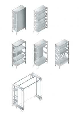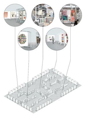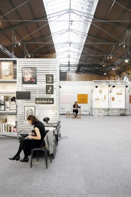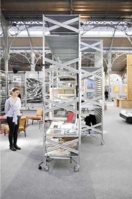 Sur le plateau de 1800 m² de la grande halle du Carreau du Temple, la scénographie se déploie à travers un ensemble de modules métalliques, inspirés des systèmes d’étagères métalliques industrielles. L’agencement des modules entre eux permet à chaque galerie de disposer d’un espace personnalisé et adapté à ses besoins.